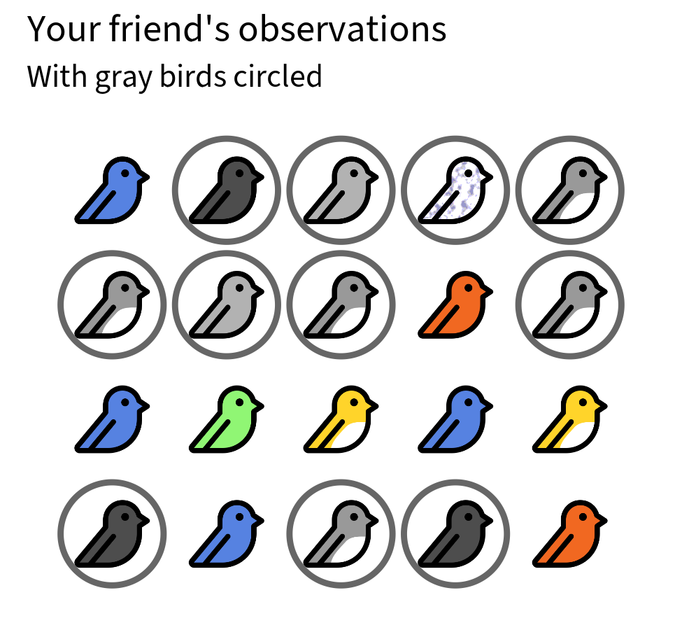 You compare notes with your more experienced bird nerd friend across town and are shocked to see that more than half of the birds they counted are gray! Is the wildlife in your neighborhood really that different from theirs? Should you be worried about a dangerous predator going after gray birds near you? Or could something simpler be going on?